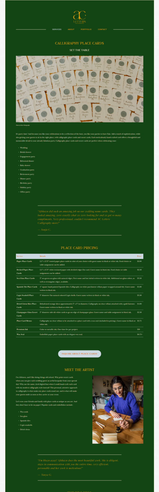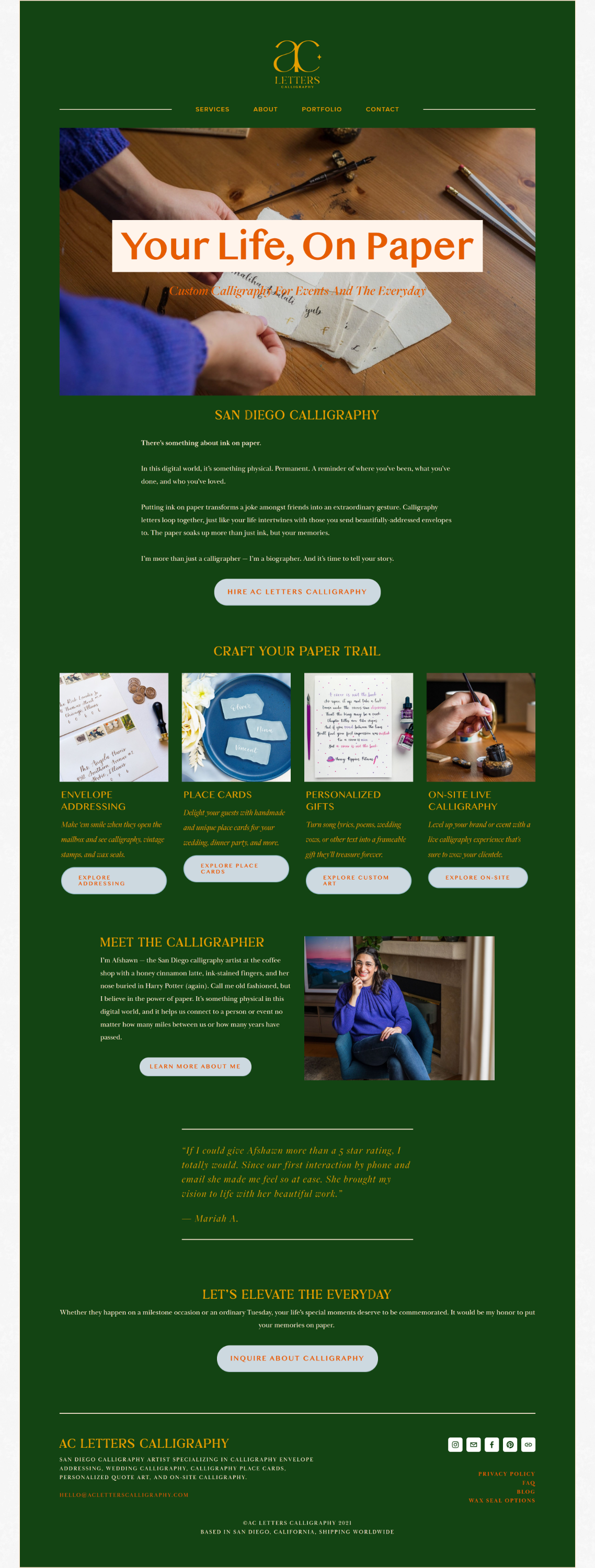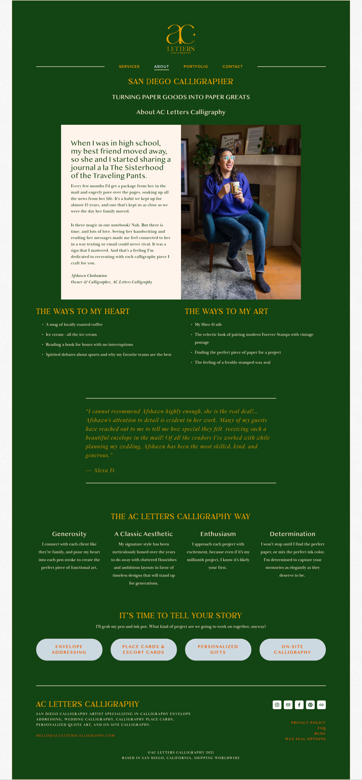 She had chosen the rich forest green as her site’s background color because it was her fave - but just because a color is stunning doesn’t always mean it works best at full scale. Across entire pages, it started to feel heavy, and her calligraphy no longer felt like the star.